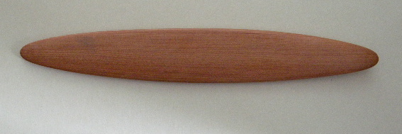 At first I was worried that the color of the wood might somehow transfer to what I was folding, but that didn’t happen. I like the lightness and the softness of the wood as compared to bone for some applications– it seems less likely to damage soft paper, for example. The symmetrical shape makes it easy to pick up and use without having to check which end is which. It is slightly wider than most bone folders, which makes it more comfortable when folding for extended time periods. The cross-section is symmetrical and fairly flat, again, I found it useful for general smoothing as well as folding.