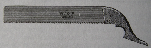 This illustration is from a Ward and Payne Ltd., Sheffield catalog, circa 1910’s. This is called a Turkish Saw (aka. Monkey saw) According to Salaman’s Dictionary of woodworking tools, they are common in Greece, Crete and Turkey and are used as a dovetail or small tenon saw. Again, it cuts eastern style on the pull stroke, so the blade can be made thinner. And like the knife above, the handle looks very comfortable, since it extends near to the wrist at the very end.