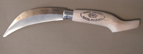 This folder is called “zivana” here. Some also call it “bicki” or “testere”(saw). I am unable to write the pronunciations; sorry for that. It is used for pruning. It is -obviously- somewhere between a saw and a knife. It is serrated because it performs better than using a plain edge blade when pruning.