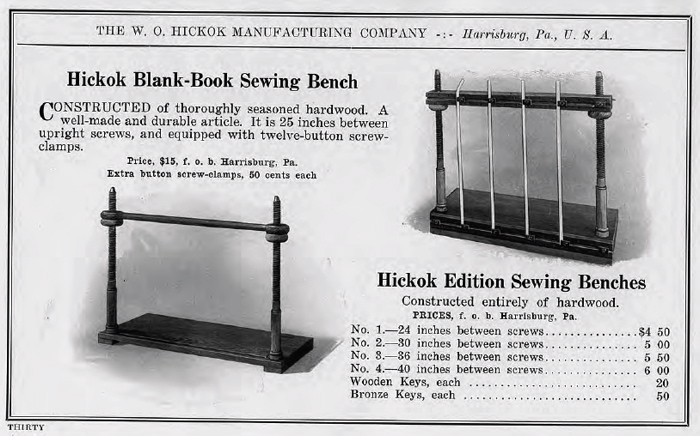 A while ago, I wrote a post about blank book hammers, rounding hammers and backing hammers. Both Tom Conroy and Gary Robberts felt certain that nomenclature was basically for marketing purposes, and they are most likely correct. However, when looking at sewing frames, in this case from Hickock, it is clear from the function that blank book sewing frames and edition sewing frames are two different animals. The blank book sewing frames only come in one size, 25 inches, and it appears they have something similar to ‘t-slots’ to hold the sewing tapes secure. Edition sewing frames, with keys, can be used for cords, tapes, thongs, etc. But blank books, at least in this time period, were almost always sewn on tapes. The design looks like it would be easy to get the proper tension on the tapes. These frames must be quite rare, and I wonder if the high initial cost–almost 4 times a similar size edition sewing frame– made them an anomaly, if they didn’t work well, if the depression killed the market, if many of them were trashed when the blank book market disappeared or if it is some combination of all of these.