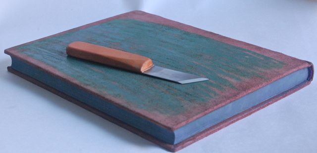 Most bookbindings function as protection for the text contained within. This, however, is a bookbinding that also functions as a strop. I rebound Ron Hock’s The Perfect Edge: The Ultimate Guide to Sharpening for Woodworkers in reverse calf in order to make it work as a not-so-fine binding/ strop. This book is one of the best on sharpening, containing an excellent overall assortment of information. It is loaded with practical advice, overviews of the various sharpening systems and informative photos. I recommend it as a textbook to accompany the sharpening workshops I teach.