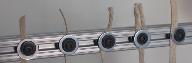 Fig. I: The Nokey Sewing frame strung up with a tape, thin cord, thick cord, double cord and slit thong.
