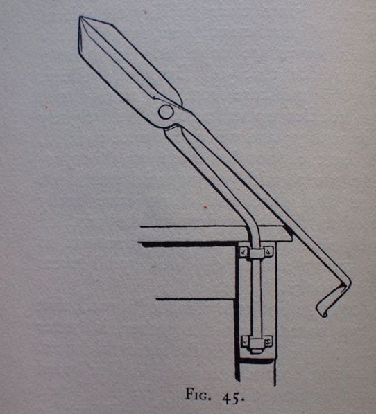 Cockerell notes that if “The straight arm of the shears is the one to fin in the press, for if the bent arm be undermost, the knuckles are apt to be severely bruised against the end. Any blacksmith will bend the arm of the shears and make the necessary clips. This method saves considerable wear and tear to the ‘lying’ press. Where a great many boards are needed, they may be quickly cut in a board machine, but for ‘extra’ work they should be further trimmed in the plough, in the same way as those cut by the shears. (pp. 126-127)” I’d be curious if anyone has a lying press with some telltale indentations at the ends? I wonder if board shears of the time gave a slightly rough, crude cut, or was it just tradition to later plough the edges? Ellen Gates Starr, an American who spent 15 months studying bookbinding with Cockerell, seems to mention this method of attaching the shear in the 1915 Industrial-Arts Magazine. “The boards are roughly cut to approximate size (We do it with a huge pair of shears of which one handle is made fast. I have never seen a pair except for my own in this country) (p. 104).” Were millboard shears that uncommon in the US? It seems that by the 1920’s, millboard shears had gone out of fashion. Thomas Harrison remarks in 1926, that, “…millboard cutters are now used instead of the shears…” (p. 65) But he includes an image of the Cockerell type attachment, although given the similarities of the renderings, I’m tempted to speculate that Harrison was at the least highly influenced by Cockerell’s drawing, or it may be a copy with slightly altered perspective.