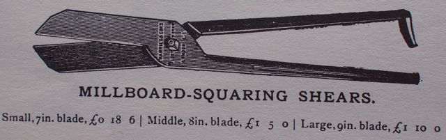 The Harrild and Sons catalog has a picture of their ‘millboard squaring shears”, stamped with their logo– note the the market was large enough for them to carry three different sizes, a 7″, 8″ and 9″.