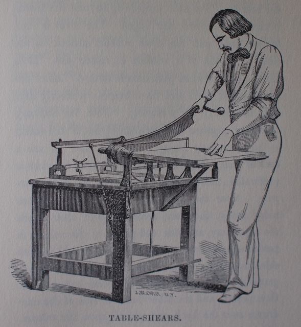 Three years ago, I wrote a post about board shears and their relationship to boarded and early case binding. But before the board shear (aka. board chopper, table shears), which likely entered bookbinderies in the 1830’s, millboard shears were used for trimming book boards square. They are essentially large tin shears, bench shears, or tin snips as they are commonly referred to. I had never seen a pair of these, except in early manuals and in a great photo from Middleton’s Recollections on page 37. The caption for the photo, taken in 1999, notes that this was the first time he had used them since 1960.