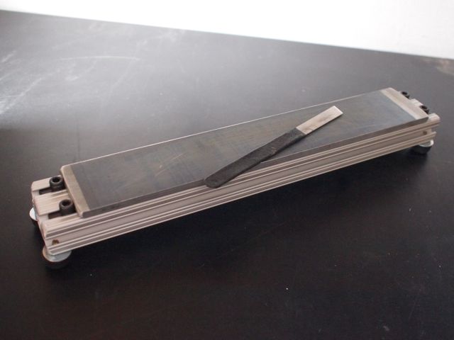 For those who use my aluminum sharpening system, I recently developed a support for the plates. Made from aluminum, four cap head screws clamp the plates securely, yet it is quick to switch them. The rubber feet keep it from sliding around on the workbench and help keep it clean. The height, 1.5 inches, gives hand and finger clearance when sharpening, especially when working perpendicular to a workbench. This is what I use to make all of my knives, although I have dedicated stands for each of the four grits I recommend.