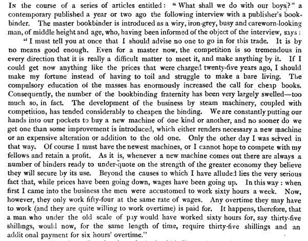 It is odd to be in a field that has such a long history of not just pessimism, but an impending sense that the entire trade is nearing death. But this must be tempered with the knowledge that this has continued for at least 120 years, and likely much longer. A long, slow death, indeed. So when I attempt to dissuade a young, would be book conservator from entering the field, perhaps I am just continuing this somewhat old tradition. Or maybe it is an established method to keep the field populated by those who are passionate, determined, cantankerous, and foolhardy enough not to be deterred by its eternally gloomy future.