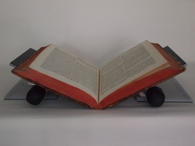 I developed the in-situ book conservation fixture to securely hold a textblock open while performing page repairs, working under magnification, media consolidation, etc. It is large and heavy, and can easily accommodate parchment textblocks.
