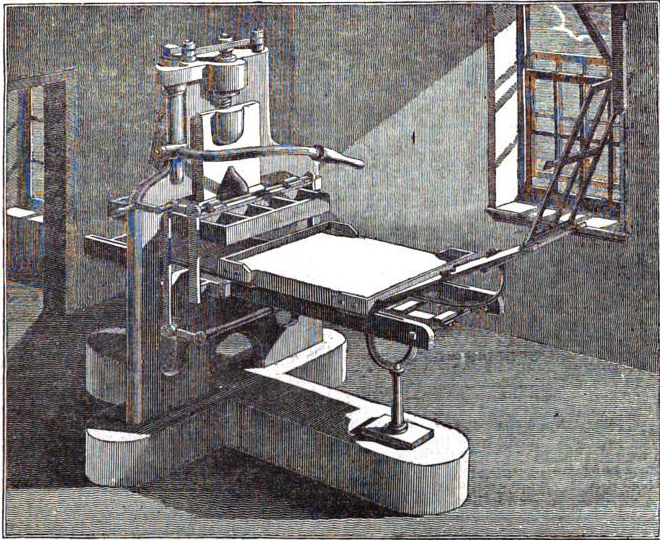 I found this image of a Stanhope press quite provocative. I imagine it is lit by the moon–a full moon? — notice the highlights on the cloud visible through the window. This quiet press glows with a pale whiteness, waiting for ink blackened type, which like the darkness outside is full of possibilities. Is this press coming to life; rising out of the cross it rests on, its bar reaching towards the light? There is a loneliness here: no people, no ink, no visible type, no printed sheets. The open frisket and windowpane visually merge; a reminder, perhaps slightly cliched, that the printed page is indeed a window?