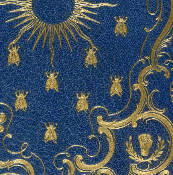 Fig. 3: Detail. Note the laurel leaf flanked fist and bee like alien creatures flying up into a highly stylized sun. Technically, this is known as awesome. British Library Database of Bookbindings.