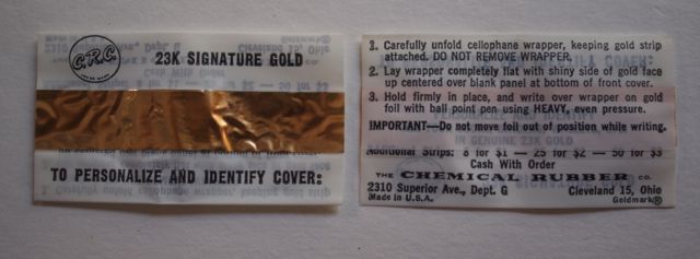 Chemical Rubber Company (CRC) foil packaging suggests it can be used for personalizing and identifying books, wallets, etc. The CRC foil packaging sports a clever design, since the wrapper also forms a clear window that is used while writing, to prevent tearing through the thinner foil. The CRC began in 1900, when Arthur Freidman invented and sold a chemical resistant rubber apron for use by chemistry students. Later he and his brothers published the first Handbook of Chemistry in 1913: it is still in print, currently the 92nd. ed. The original 1913 edition is described as “apron-pocket size”, the current edition is considerably larger, perhaps necessitating a kangaroo sized pouch.