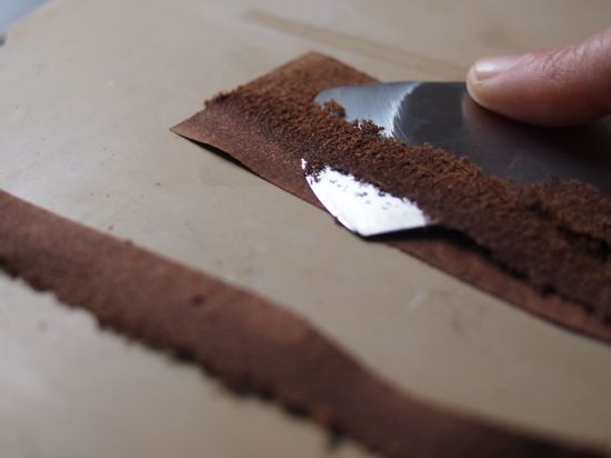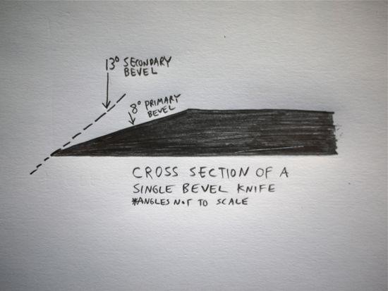 The cutting edge of this knife is slightly wider than the narrow Swiss and French knife that I currently make, but the length of the blade is wedge shaped so the area that is gripped is still comfortably narrow. Also, it has a secondary bevel, which accounts for the strange looking, extremely acute 8 degree primary bevel. The advantage of a secondary bevel is that there is much less metal to remove when resharpening or stropping. This is especially the case with a thick and wide knife like this. The primary bevel is fairly roughly ground: only half a millimeter of the secondary bevel, which is the cutting edge, is fully sharpened and polished. In a normal knife of this thickness, the length of the bevel would be about ten times this amount. Although I don’t think the time spent sharpening the bevel corresponds one to one, it does take significantly less time.