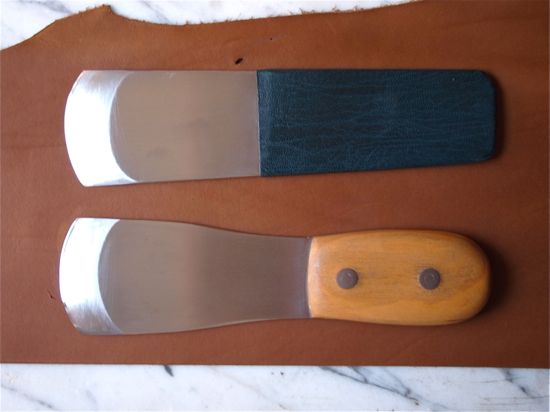 The drawback of a secondary bevel is that there is not really enough metal to feel it resting on your sharpening system, so this knife is recommended to those that have some experience in sharpening. This wide cutting edge is useful for hogging off leather for edge paring and also used in a scraping manner for headcap and spine areas. The slight wedge shape on the leather handled knife, and the rounded thumb holds on the wood version provide excellent control.