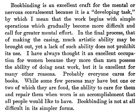 While not necessarily mental or nervous, I recall one or two of the smaller British manuals I have mentioning that bookbinding was a suitable craft for disabled veterans of the Great War and similar. The projects within were often desk sets and file organizers, things most manuals no longer describe and many binders today would find challenging if only because unfamiliar.