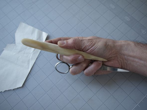 A hairdresser showed me this move. She said she had also spoken to a surgeon who uses a similar technique. It allows you to safely keep the points of the scissors away from whatever else you are doing, without taking them completely off your hand and putting them down. A couple of years ago I wrote about Palmer’s proper method for using scissors, which deals with how to hold the paper to make a straight cut.