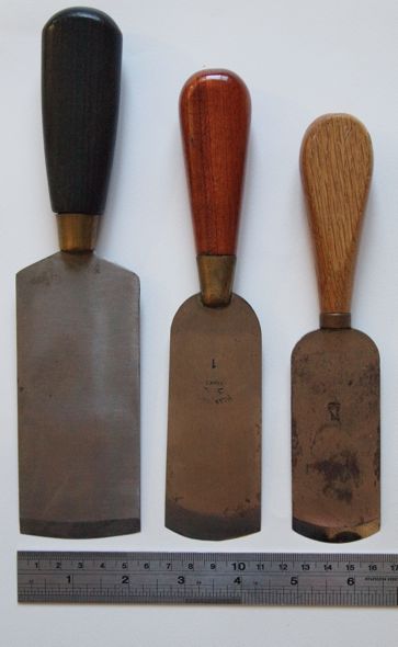 In terms of scraping, when I learned to use the Swiss paring knife (curvature of blade and proportionate width to your “big old” but without the wooden handle) that also included scraping, especially at headcaps and corners to thin down leather. Process/motion identical to spokeshave. Sharp blade, flattish angle, light touch – works great.