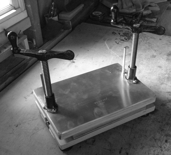 In preparation for an upcoming workshop, I realized we could use an extra press. I wanted something slightly nicer than the a basic four carriage bolt type, but didn’t need another real book press. This version, which we will test out in July at the Winterthur Historic Structures Class, fulfills several basic requirements: relatively inexpensive, rock solid, the platen stays up so that you can accurately load it, and it is easier to use than carriage bolt style presses.