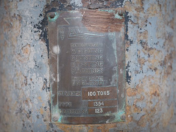 Upon reading the nameplate, it turned out this was a scales and not a press. Likely the machine which did the measurement fit inside the platens, and the screw was a way to calibrate it. I also think this machine was connected to the inside of the brick making kiln behind it.