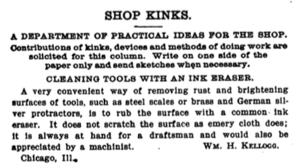Daniel Mellis send in this useful info concerning surface cleaning rusty tools; which, ahem, some of us may have a small number of. Originally this idea was published in the column “Shop Kinks” from Machinery in 1907. It’s a wonderfully provocative title — I may have to steal it — a refreshing take on usual “Tips and Trick”. A kink, in this sense, is a new aspect, twist, or take on something.
