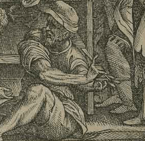 More tools appear on the title page of this book, where a man is stropping or sharpening his razor under the dissection table. The portrait of Vesalius also contains a partially hidden razor lying on the table as he holds body parts of a cadaver. In this case, the razor represents his practical knowledge and experience. His intellectual and theoretical prowess is symbolized by the inkwell and manuscript page on the table behind arm.