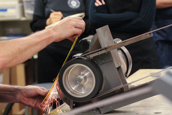 I cover all aspects of sharpening related to bookbinding: blade angles, bevel angles, types of steel, types knives, types of grits, grit progression, hand grinding using power tools, free hand sharpening, and stropping. These techniques can be adapted to virtually any type of sharpening system: oil stones, diamond stones, waterstones, lapping powders and finishing films. Free hand sharpening throws many students into the deep end, for a while, but ultimately equips them to sharpen most types of edge tools. Most bookbinding knives have complex shapes and handles which preclude the use of jigs or honing guides.