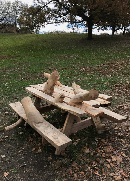 I’m always interested in artwork that references tools or functional objects. This artwork is located in Inwood Hill Park, NYC , and interrogates a common functional object, the wooden picnic table with attached bench seats. An all too common approach when creating an artwork referencing a functional object is to do one of two things; somehow make the object non-functional, or make a replica of the object out of a material that cannot function (such as making a wrench out of clay). Here, however, the artist considers the history of the wood, so instead knots left in the wood, the branches are left on. The result looks quite tortured, much like the making of this object must have been. It reminds me of W.S. Merwin’s poem, “Unchopping a Tree”.