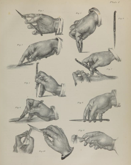 Learning traditional techniques of tools use are often easier than trying to figure it out on your own, which is why they became traditional in the first place. Just consider the variety of hand positions Pancoast instructs the surgeon to learn in order to control the bistoury, pictured below. There is a following plate of even more advanced moves. I doubt many of us could come up with these on our own. Even though I have not used a bistoury, the hand positions make sense for the tasks I can figure out, like depth control (Fig. 2) and extra power to make an incision (Fig. 3). Perhaps it is better not to interpret all of them.