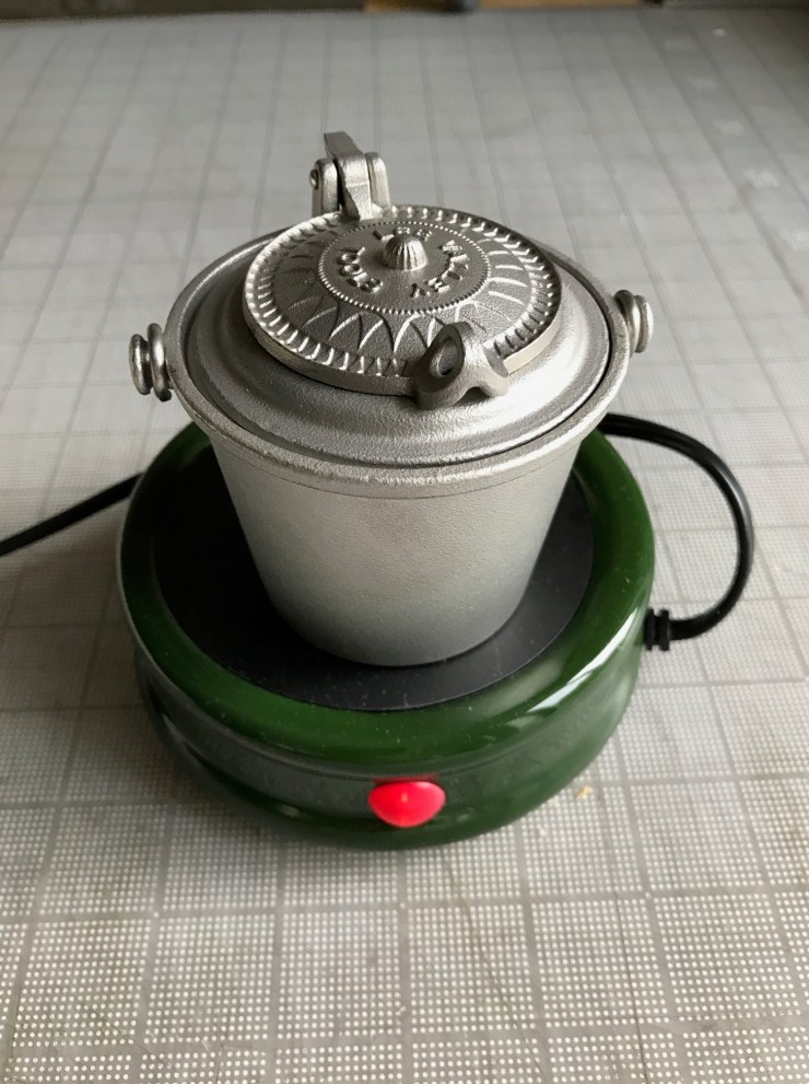 It works great with gelatin in conservation work or with hide glues for historic models. The heavy cast steel double boiler gives a very gentle and even heat. It is based on a Landers, Frary & Clark glue pot from the 1870’s. There is an image of the original, which was cast iron, in Stephen Shepherd’s hide glue book. (1)