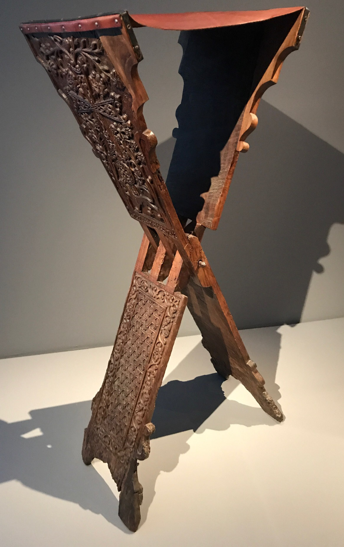 Great write-up, but the Whackypedia reference to a “rehal” or riḥāl (رحال) as the term for a traditional Islamic book stand is odd, for it is actually the plural form of raḥil (رَحل), which is the common term in Arabic. Other terms encountered are raḥla (رحلة), and kursī (كرسي), the latter is often used today in Egypt. (See Adam Gacek, Arabic Manuscript Tradition, 54 and idem, Arabic Manuscript Tradition: Supplement, 28, who cites Lane’s Lexicon among other sources). Raḥil is also used in Persian and Urdu, while rahle, derived from the Arabic raḥla, is used in Modern Turkish. Note that these terms apply to all manner of lecterns, cradles, and book stands, not only for Qur’an manuscripts (muṣḥāf/maṣāḥif) but also for reading other books. Very large cradles, replete with a platform for the reader to sit upon, were constructed to accompany very large luxury manuscripts placed in elite mosques during the Mamluk period. While small stands are commonly cut from a single piece of wood, others are also made of laminates (for example, inlaid khatam-kārī stands produced in Iran). Finally, the Armenian example in the exhibition appears—at least to my eye—to be cut from a single piece of wood, judging from the continuous grain observed not only on the outer face, but also the rough side on the part immediately behind it in your detail shot. I suspect the line was simply a mark made by the carpenter to demarcate where to cut the plank?