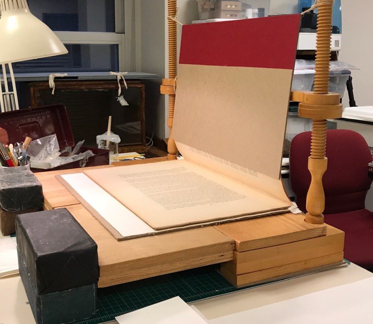 Sewing frames are often quite shallow, so extending the bed, as pictured above, keeps the leaves flat and is a must for accurate sewing. Otherwise there are always weird tensions in the finished binding. Ā AĀ loaded stickĀ also helps to keep the sewing under control and the spine in good shape.