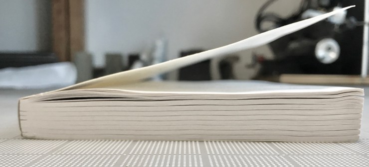 Whatever glue was used on the spine (PUR?) grips the newsprint-like leaves solidly, with no throw-up and lots of drape, making the book easy to hold and read. I’m embarrassed to admit this, but the tactile qualities are very satisfying in this book, at least in the short term, better than many high-end hand bound books.