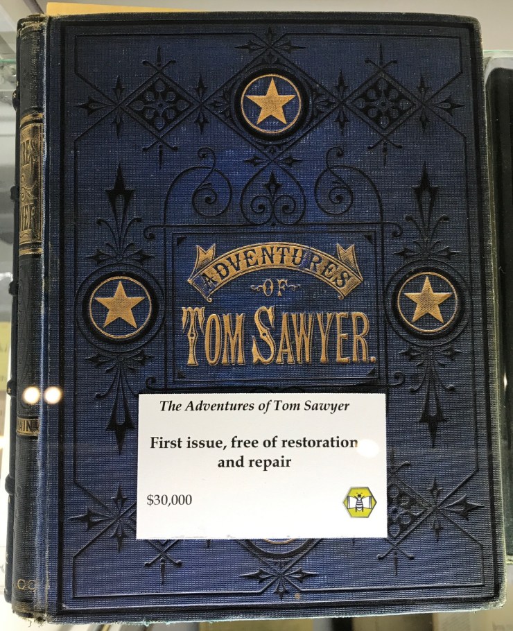 Yet I fear the book dealer’s sign on this Tom Sawyer may swing the pendulum too far. Although I only looked at this book under glass, I could think of a few very minor treatments that would greatly extend the life of this object when handled, without impacting its aesthetic value, use value, patina or other inherent qualities. Is “free from repair” a good thing if the joint continues to tear with each opening? Or was the dealer sophisticated enough to distinguish between restoration, repair and conservation?