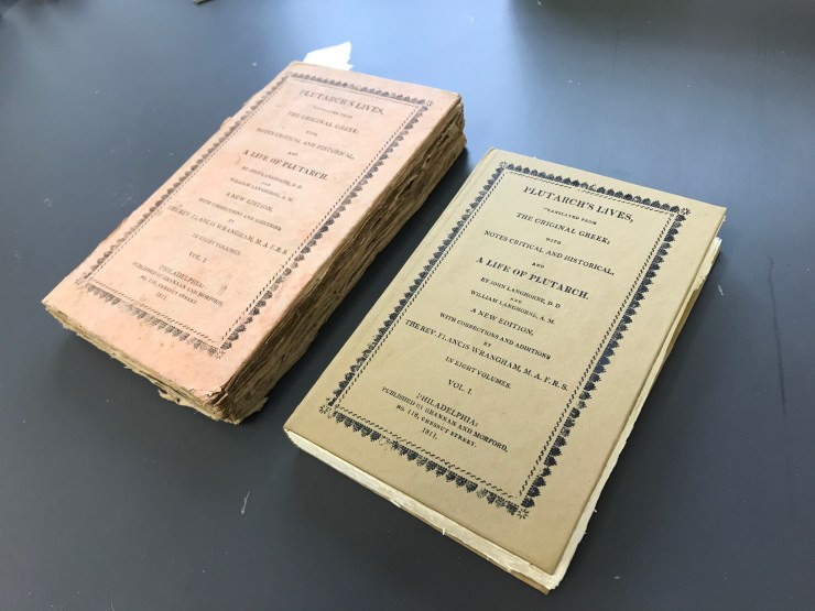 I’m especially interested in books that were used by regular people, not just fancy bindings made for the 1%. Above is an example of the cheapest bound book available in the early nineteenth century, a Publishers Boards Binding. On the right is a model of the actual book on the left.