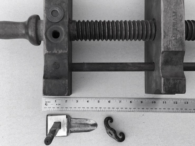 As Jeff points out, the big wing nut is a diagnostic point; but to me it suggests English-not-American even more strongly than age. On Hickok ploughs the blade-holding mechanism and other metal parts tend to be machinists’ work, while on English they tend to be blacksmith’s work. Not a difference of function (in fact the English style is functionally better than the more highly regulated American form) but one of style of finish. However, by the end of the 19th century most of the Hampson Bettridge presses I have seen have cast brass wing nuts, not wrought iron, though of similar less formal workmanship; so the wrought iron wing nut suggests earlier to some extent, as well as English.