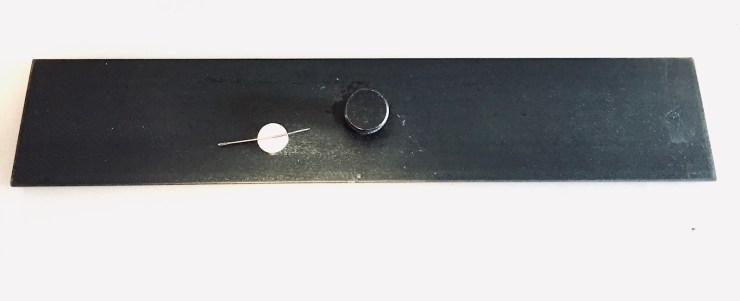 First off, a custom weight made by Randall Hankins of Salt Lake City. I have many weights of Randy’s as well as heavy things found over the years like massive things to hold x-ray machines in place. After making do with essentially the wrong things for decades, Randy and I designed these sixteen inch long weights so that some of the endpapers varieties I make could be selectively weighted or just kept from moving. I have a pair and I could not now work without them. Being steel, magnets can be applied — here is one catching a needle.