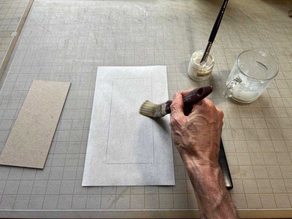 In my Layered Adhesive technique, different brushes are used for each layer directly on the cloth instead of mixing adhesives together before application. It sounds a little like amateur hour — I know — but allow me to explain. Each layer of adhesive performs a different function. I’ve been using this technique on all my boxes since 2023.