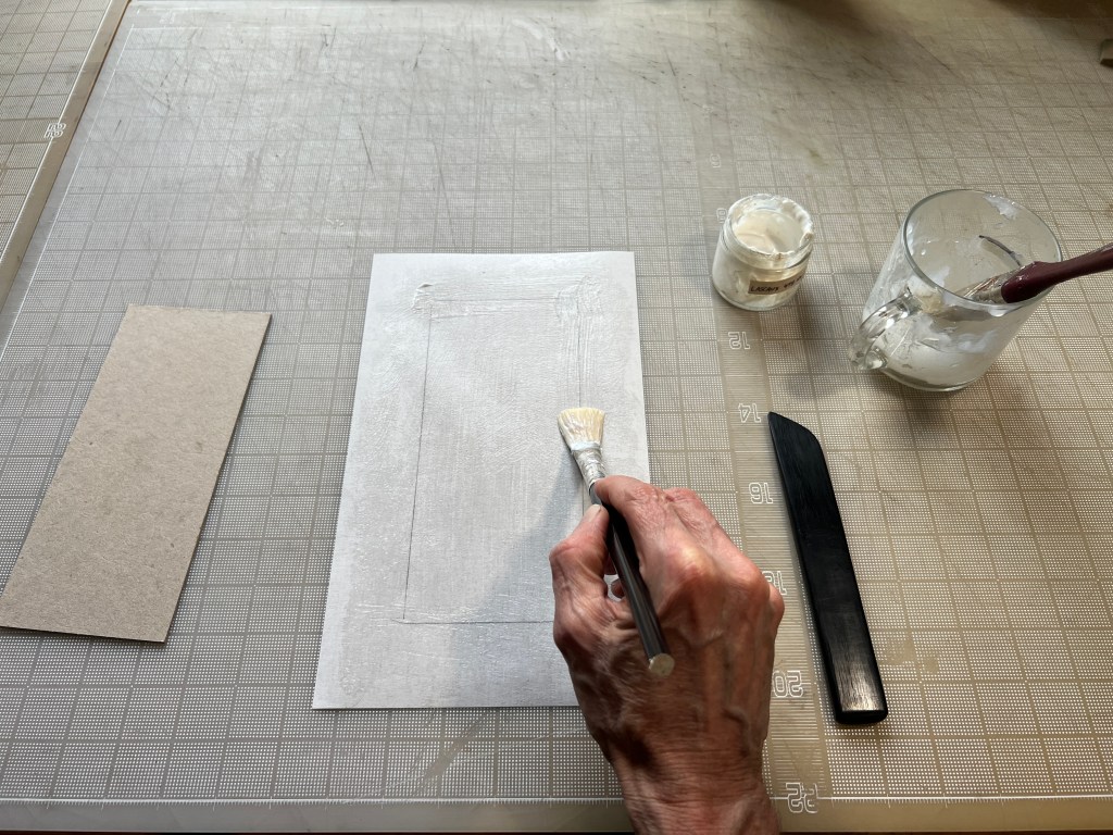 Fig. 3. Coating the Halflinnen cloth with paste. Note the thick paste. A tiny jar of Lascaux 498HV uses a  separate container and brush.