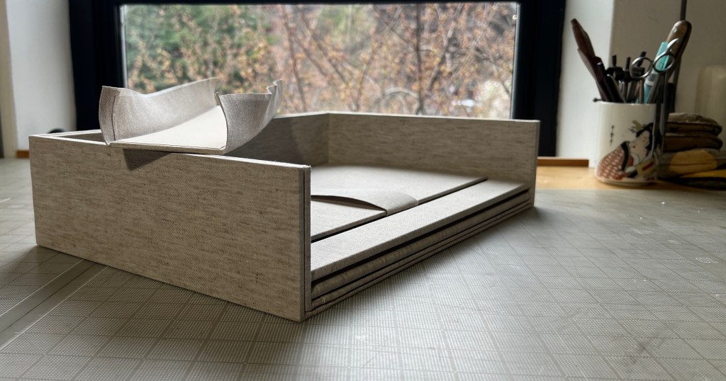 Fig. 5. An in-process cradle box, using the layered adhesive method. I just need to make the case and glue everything together. The flat spinepiece is an improvement from Annie Ujifusa, the wedge pull mounting (at the bottom) is Mitchel Gundrum’s idea, and I’ve started making these 5cm wide bookcloth pulls for ease of opening. Laminated with PVA of course!