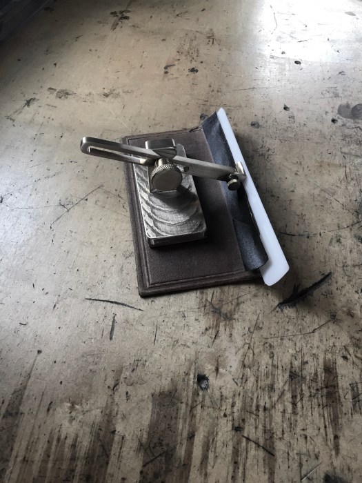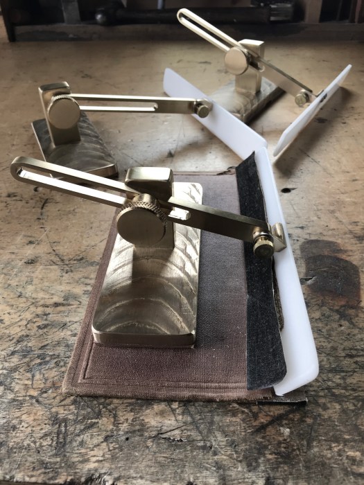 This jig to improves on several problematic aspects of traditional rebacking jigs, which are often made of bent sheet metal or plastic. The first version I saw was a metal one that Don Etherington showed me in the 1990’s. To aid exact board alignment, this jig has enough weight to stay in place and keep the board in place. It features an adjustable angle delrin plate to support the lifted leather at any place necessary, so the fragile lifted edge is supported and protected without being stressed. Since the base of the jig is spaced away from the lifted area, the bend of the original leather can be monitored to avoid compression cracking. The delrin shield is easy to clean off when working with adhesives on the new material under it.