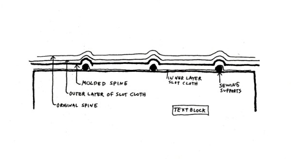 -Cover the lifted spine with thin cling wrap, build 2-3 layers with wheat starch of very thin western paper or stiff Japanese tissue, tie up in a press to mold exact sewing support pattern