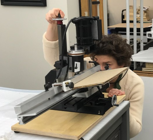 The original Peachey Board Slotting Machine, developed in 2005, is used in conservation labs around the world. It is, however, a somewhat large and expensive machine, and best suited for large institutions. The Manual Peachey Board Slotting Machine is a new affordable alternative for individuals, regional centers, smaller institutional labs and even larger labs with space limitations. This smaller machine can be moved out of the way when not in use, freeing up valuable bench space. It is also simpler to operate.