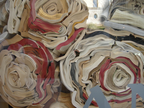 I’m always a bit uneasy when I see books that have been mutilated, whether it is done in the name of art, censorship, vandalism, or commerce. I would have given no pause to this window if it were filled with broken laptop computers or ebook readers, which indicates some fundamental differences between our relationship to virtual and “real” books. It is a sign that book arts have entered the mainstream when designers adopt their techniques– part of the filtering of ideas from “high” art to popular culture. I noticed Brooklyn Public Library and Appleton Public Library (Wisconsin) stamps on some of the tail edges, but all libraries have to deaccession books. Is it better to do a surreptitious run to the landfill or recycling center, or should they “live a second life” as some might argue this display illustrates?
