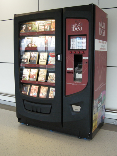 I saw this book vending machine in Gatwick Airport in 2008. The company is called “Novel Idea” and won a 2007 BAA Gatwick sparkle award. Most of the books were paperbacks selling for 4-8 pounds. I recall some book artists at University of Iowa Center for the Book doing something similar a number of years ago. Looks like lots of “art-o-mat” machines are dispensing art, and their web site states Clark Whittington invented the first in 1997.