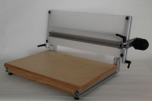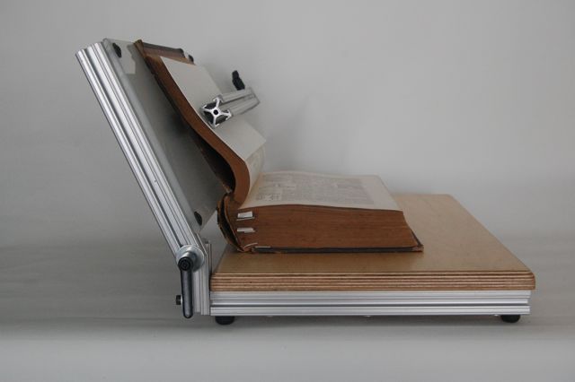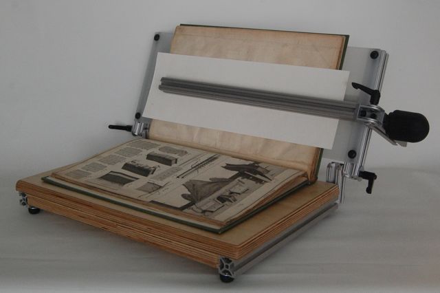 The bed size is 12 x 17 inches, a heavy anti-tipping 1.5” thick, and the maximum supplied thickness books is 6 inches. Fits octavo through folio books. If a thicker book is encountered, extension pieces can be purchased for a nominal charge. This support can be used with oversize books with slight modifications, instructions included. Adjustable arm levers allow a full range of clamping angles, no tools necessary. The front page bar is hinged to allow quick page turns. The uprights hinge from 0 degrees (parallel to the bed) to 180 degrees. Constructed out of aircraft grade plywood with a 1.5” thick base to resist tipping, polypropylene and clear anodized 6105-T5 aluminum. Custom sizes available.