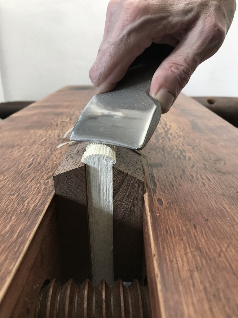 I reproduced the gentle curve on the Frottoir from examples in my historic collection. This tool is not a die meant to exactly shape a spine to its curvature. A gentle curve is much more useful for a range of round spine shapes, smoothing irregularities, smushing sewing threads, etc… . The teeth can be cleaned of adhesive with a stiff brush. This tool is quite heavy, and the weight allows you to easily persuade even hard modern paper into the shape you desire with little effort.