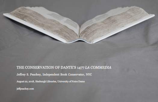 The conservation treatment of the Hesburgh Libraries’ important copy of Dante’s La Commedia (Venice: Vindelinus de Spira, 1477) will be detailed in this profusely illustrated lecture. Its deteriorated and damaging 20thcentury binding structure will be described, as will considerations and decisions leading to its resewing and rebinding in a historically sympathetic alum tawed goatskin conservation binding. Evidence uncovered during treatment, which suggests the Inferno and Purgatorio cantiche may have circulated separately at one point, will be explored. Differences between historic 15th century binding practices and modern conservation binding techniques will be highlighted, as will the sometimes problematic differences between historic and modern materials. An overview of aesthetic considerations for conservation rebinding will conclude the lecture. Bibliophiles, conservators, librarians, Italian scholars, and anyone curious about the physical structure of books will find this lecture of interest.