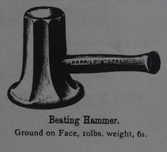 Traditional beating hammers had a bell shape, like the one pictured in Jost Amman’s bookbinder print (1568). This shape continued into the 19th century, like this Harrild & Sons beauty from 1892. I need a bell shaped beating hammer!