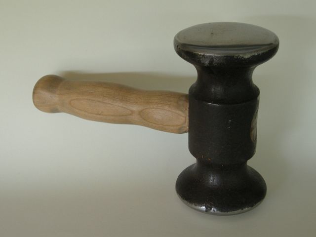 Currently, beating hammers are notoriously difficult to find– I have been looking for over a decade. Since the practice of beating has gradually declined throughout the 19th and 20th centuries, many of these hammers must have made some kind of gradual evolution from working tool, to doorstop, to the bottom of the closet, then sold for scrap, or left to rust. Thanks to a hot tip from the anonymous bookbinder, I managed to purchase not one, but two last week.