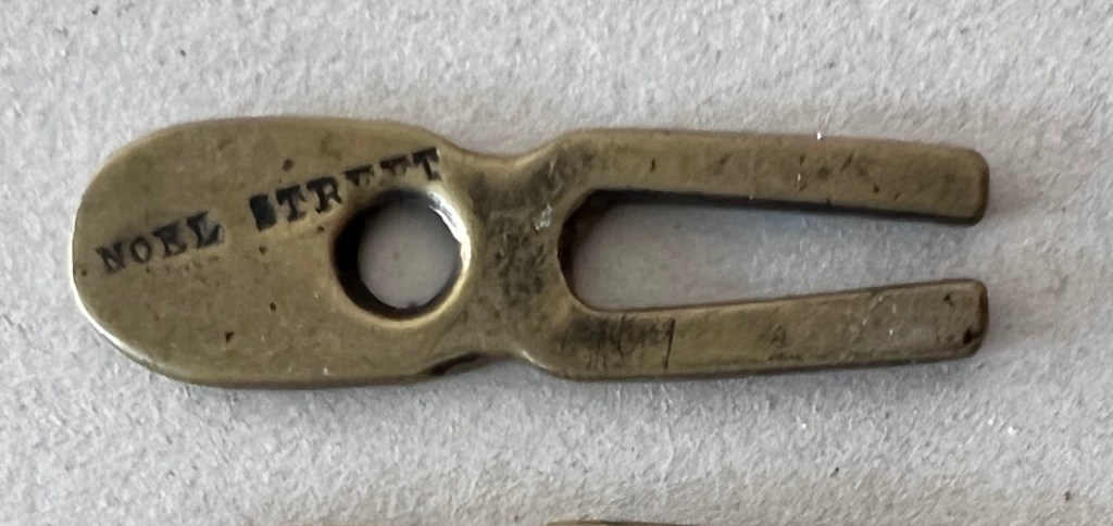 Dating small bookbinding tools is rarely possible because there are few pictures of them before the 1880s, and the early pictures were reused in catalogues and manuals for many decades to avoid the cost of engraving new ones. But these newly acquired sewing keys might be datable, I thought when I saw them, because they were marked “J. Wright” on two of the six broad flats, “Noel Street” on another. English language. No city, that probably meant London, “the flower of cities all,” the default, the center of gravity. Ownership mark or maker’s mark? We’ll see. To find out when and who J. Wright was, meant checking the London city directories (“Kelly’s Post Office London Directory”) year by year through the 19th century to see if a J. Wright would turn up on Noel Street, if there was a Noel Street. The slog began. He was there, in Soho, in the 1840s and early 1850s all right, down through 1854. Then he was out of the directories for a year. Was this a terminus ad quem, an upper bound, a before-which-limit to his dates of activity? In 1856 there was no John, but an address for his estate and for his widow as executor. Definitely a limit! And then…