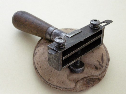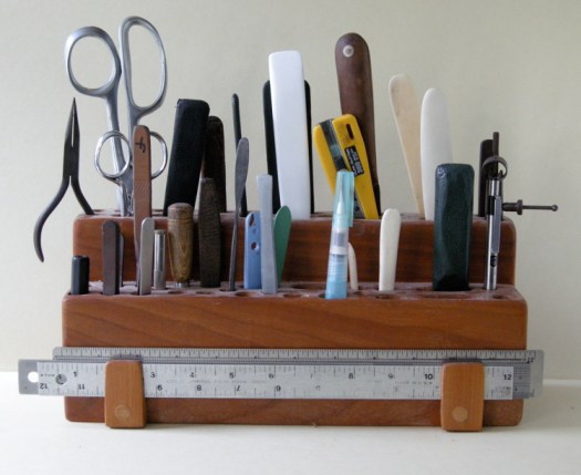 -Four rulers (one thin cork backed for tearing tissue and trimming endsheets, two thicker steel often used as spacers and to tear tissue more ragged, 7/8″ wide aluminum which is turn-in thickness)